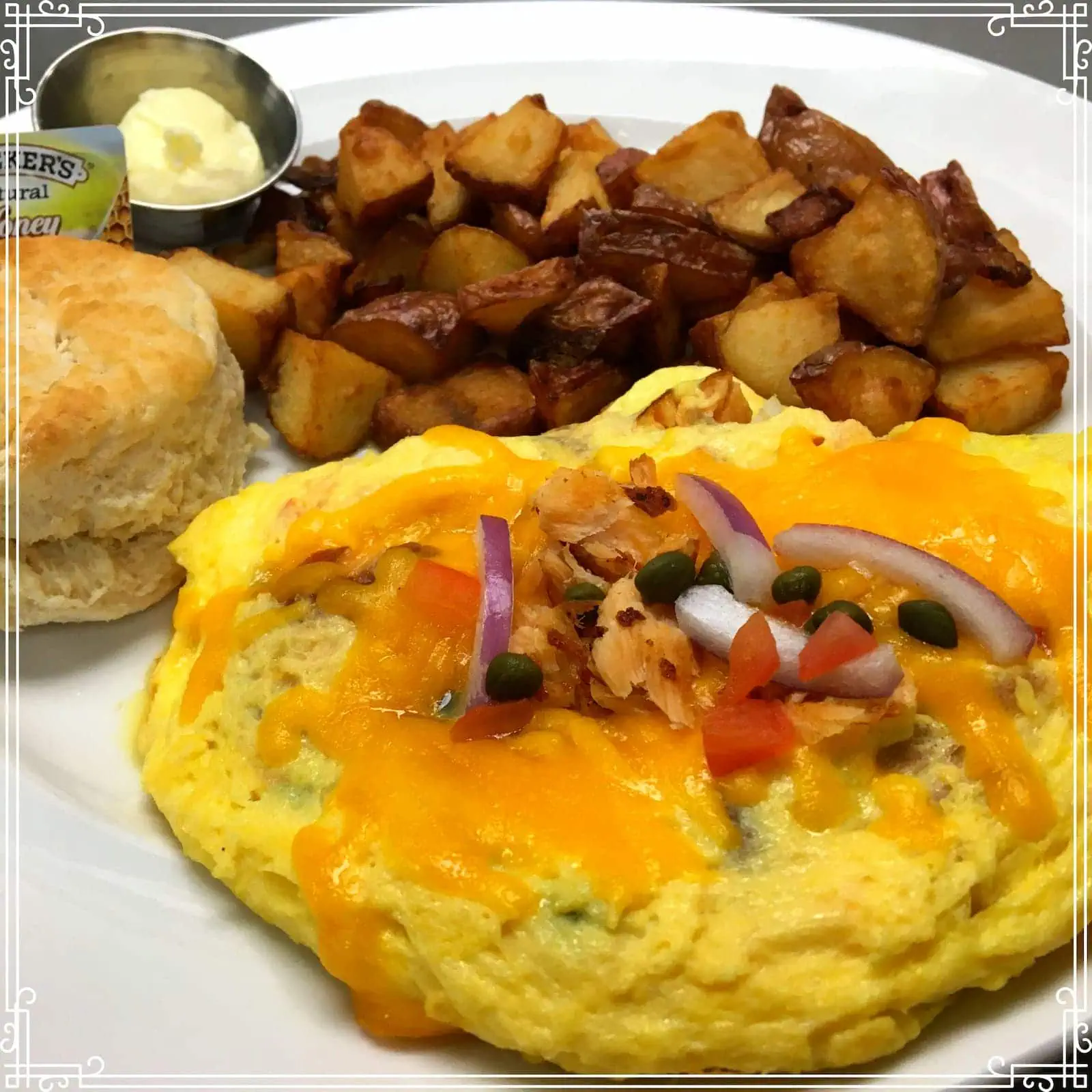 A fluffy three-egg omelet with smoked salmon from Absolutely Fresh Seafood, capers, onions, and tomatoes, topped with cheddar cheese. Served with a hot, buttered biscuit and roasted red potatoes.
