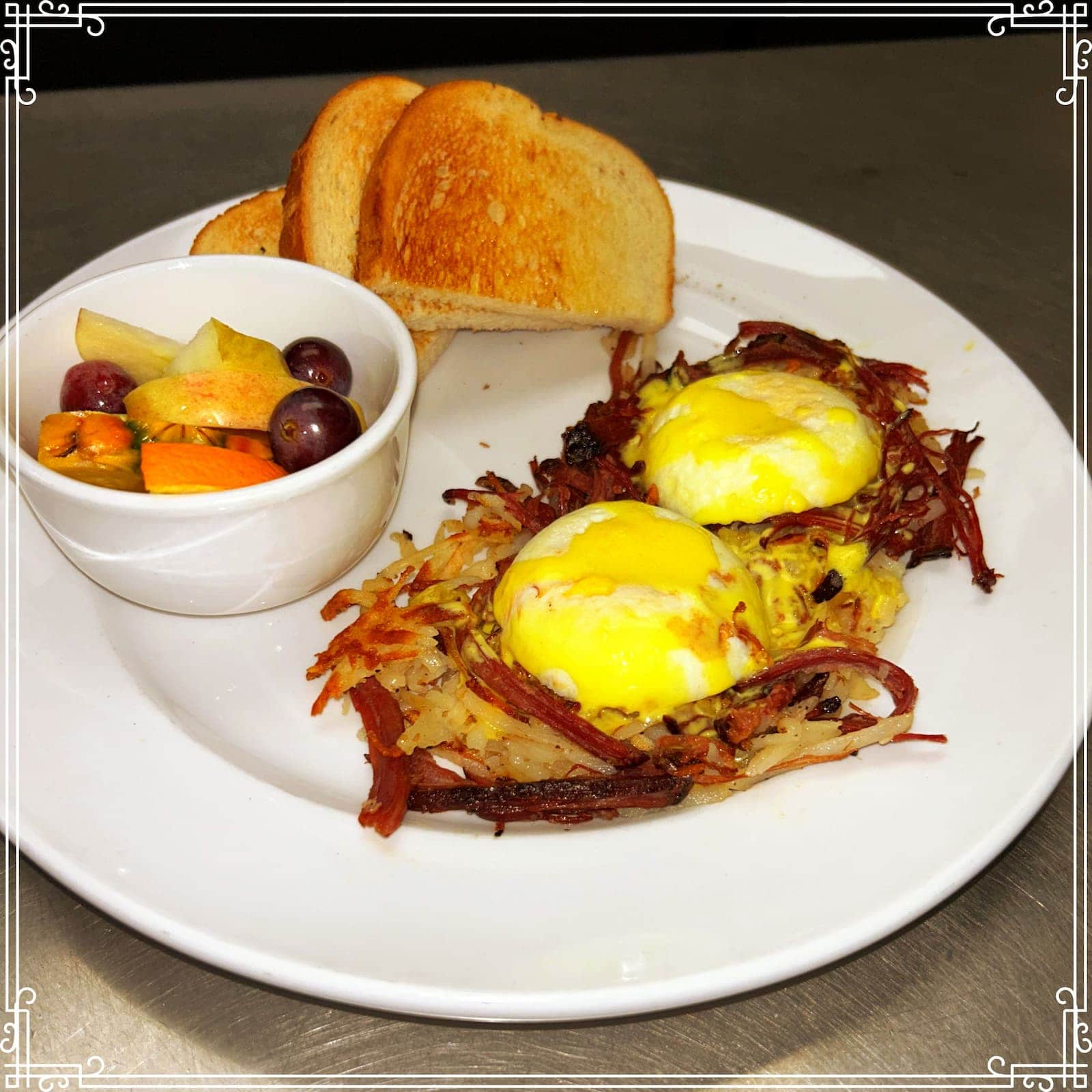 Our own Flying Pig smoked corned beef, tossed with crispy browns and topped with two poached eggs nestled in the middle, finished with house-made hollandaise. Served with fresh fruit and your choice of toast.