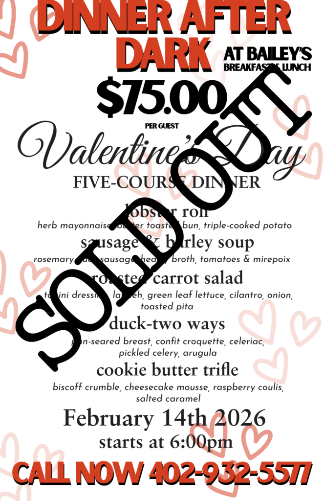 Welcome to Bailey's Breakfast & Lunch 1259 South 120th street Open 7 am to 2 pm 7 DAYS A WEEK. breakfast served open to close. We do not accept reservations. Our Weekly Specials Check out what’s new every tuesday See This Week's SpecialsOur Full Menu February Month Long Special: Red Velvet Pancakes $15.00 Would you like to be a part of the Bailey’s team? Click or tap on the button below to fill out an application online. Apply Online